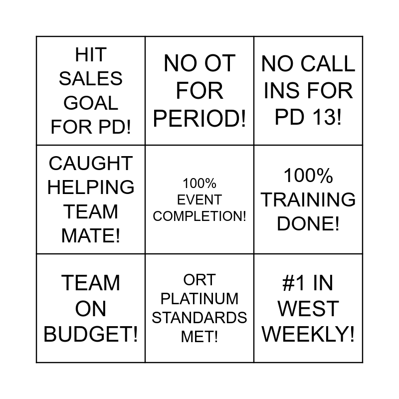 This bingo card has 9 words: TEAM ON BUDGET!, NO CALL INS FOR PD 13!, NO OT FOR PERIOD!, CAUGHT HELPING TEAM MATE!, HIT SALES GOAL FOR PD!, 100% TRAINING DONE!, 100% EVENT COMPLETION!, #1 IN WEST WEEKLY! and ORT PLATINUM STANDARDS MET!.