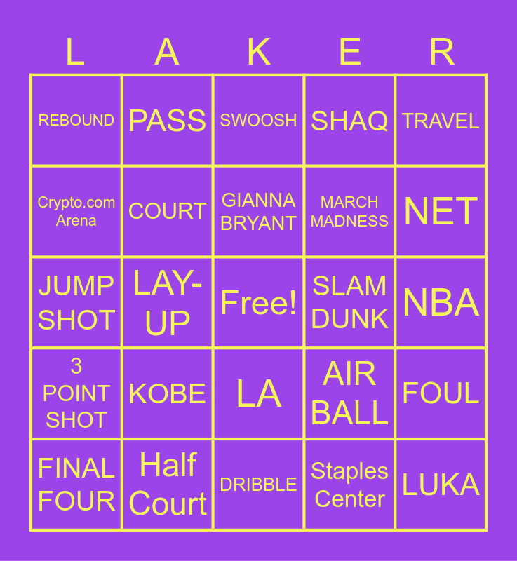 This bingo card has a free space and 24 words: KOBE, Half Court, GIANNA BRYANT, FINAL FOUR, TRAVEL, REBOUND, Crypto.com Arena, PASS, SLAM DUNK, LA, MARCH MADNESS, JUMP SHOT, AIR BALL, FOUL, COURT, Staples Center, NBA, SWOOSH, NET, LAY-UP, LUKA, 3 POINT SHOT, SHAQ and DRIBBLE.