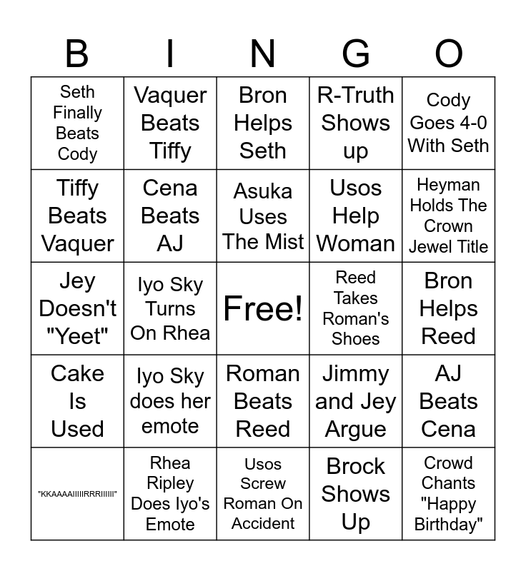 This bingo card has a free space and 24 words: Iyo Sky does her emote, Rhea Ripley Does Iyo's Emote, Asuka Uses The Mist, "KKAAAAIIIIIRRRIIIIII", Cody Goes 4-0 With Seth, Seth Finally Beats Cody, Tiffy Beats Vaquer, Vaquer Beats Tiffy, Reed Takes Roman's Shoes, Roman Beats Reed, Usos Help Woman, Jey Doesn't "Yeet", Jimmy and Jey Argue, AJ Beats Cena, Cena Beats AJ, Brock Shows Up, Bron Helps Reed, Bron Helps Seth, Heyman Holds The Crown Jewel Title, Iyo Sky Turns On Rhea, Crowd Chants "Happy Birthday", Cake Is Used, R-Truth Shows up and Usos Screw Roman On Accident.