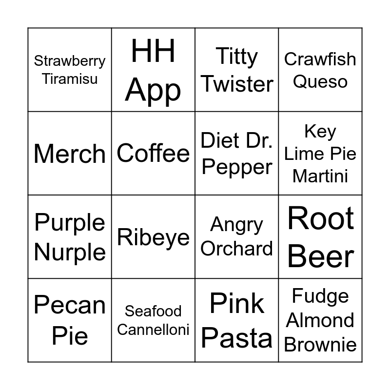 This bingo card has 16 words: Seafood Cannelloni, Root Beer, Titty Twister, Strawberry Tiramisu, Purple Nurple, HH App, Angry Orchard, Pink Pasta, Merch, Coffee, Pecan Pie, Crawfish Queso, Ribeye, Key Lime Pie Martini, Diet Dr. Pepper and Fudge Almond Brownie.