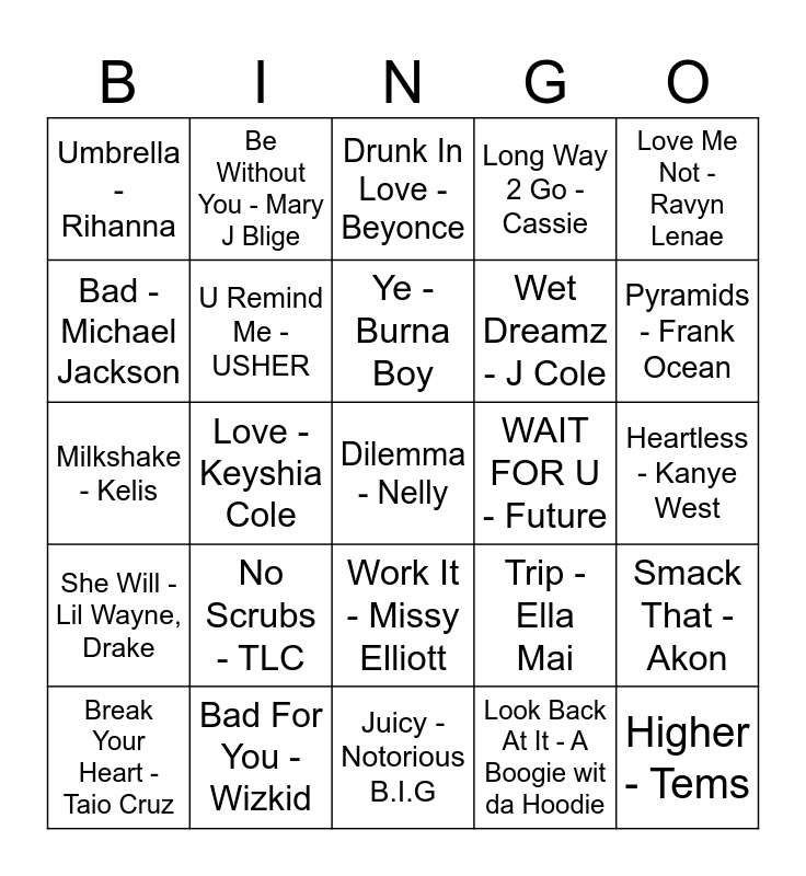 This bingo card has 50 words: Hey Ya! - Outkast, Dilemma - Nelly, No One - Alicia Keys, Juicy - Notorious B.I.G, No Scrubs - TLC, Pony - Ginuwine, Be Without You - Mary J Blige, Doo Wop - Lauryn Hill, Bad - Michael Jackson, Let Me Love You - Mario, U Remind Me - USHER, Long Way 2 Go - Cassie, Smack That - Akon, Trip - Ella Mai, Closer - Ne-Yo, Three Little Birds - Bob Marley, Ye - Burna Boy, WAIT FOR U - Future, Redbone - Childish Gambino, Love Me Not - Ravyn Lenae, Love - Keyshia Cole, Look Back At It - A Boogie wit da Hoodie, Umbrella - Rihanna, Wet Dreamz - J Cole, Please Me - Cardi B, Bruno Mars, Higher - Tems, Pyramids - Frank Ocean, LIKE I WANT YOU - GIVEON, Drunk In Love - Beyonce, Work It - Missy Elliott, Club Can't Handle Me - Flo Rida, Saturn - SZA, Run This Town - JAY-Z, Whatever You Like - T.I, Bad For You - Wizkid, FTCU - Nicki Minaj, Marvins Room - Drake, 2 On - Tinashe, Nights Like This - Kehlani, Heartless - Kanye West, Triggered - Jhene Aiko, Body - Summer Walker, Folded - Kehlani, Paint The Town Red - Doja Cat, Break Your Heart - Taio Cruz, Milkshake - Kelis, Bounce Back - Big Sean, Sundress - A$AP Rocky, She Will - Lil Wayne, Drake and Down On Me - Jeremih.