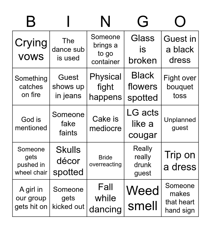 This bingo card has 33 words: Someone makes that heart hand sign, Someone makes a joke and no one laughs, Someone fake faints, Bride or groom crashout, Someone gets pushed in wheel chair, Guest shows up in jeans, Guest in a black dress, A girl in our group gets hit on, The dance sub is used, Cake to the face, Physical fight happens, Someone brings a to go container, Free!, LG inappropriate comment, LG acts like a cougar, Fight over bouquet toss, Someone gets kicked out, God is mentioned, Skulls décor spotted, Really really drunk guest, Bride overreacting, Someone brings a kid, Crying vows, Unplanned guest, Fall while dancing, Cake is mediocre, Glass is broken, Black flowers spotted, Something catches on fire, Trip on a dress, Wardrobe malfunction, Weed smell and Drunk injury.