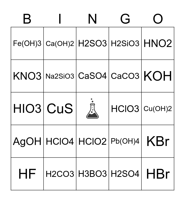 This bingo card has a free space and 45 words: HCl, HBr, HI, HF, H2S, H2SO4, H2SO3, HNO3, HNO2, H2CO3, H2SiO3, HClO3, HClO2, HClO4, HClO, H3BO3, H2CrO4, HIO3, NaOH, KOH, Ca(OH)2, Mg(OH)2, Al(OH)3, Fe(OH)3, Fe(OH)2, Cu(OH)2, CuOH, Zn(OH)2, Pb(OH)4, AgOH, NaCl, KBr, CaI2, LiF, FeS, CuS, AlCl3, MgBr2, Na2SO4, CaSO4, KNO3, CaCO3, Na2CO3, Na2SiO3 and Ca3(BO3)2.