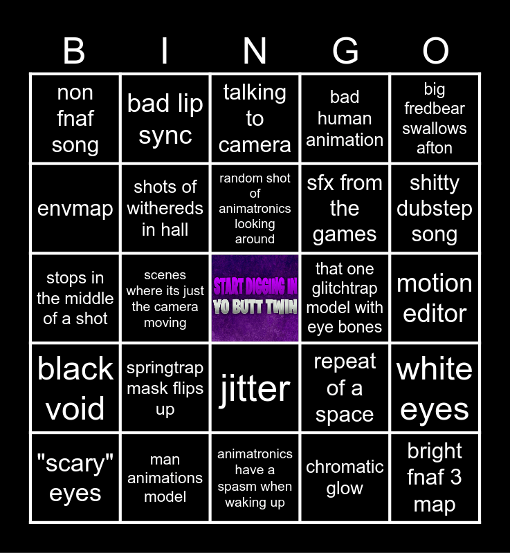 This bingo card has a free space and 37 words: blinds gobo, shot of puppet flying, withereds waking up, shots of withereds in hall, white eyes, springtrap mask flips up, random shot of animatronics looking around, spring trap, big fredbear swallows afton, shot of afton falling, scenes where its just the camera moving, bad human animation, bright fnaf 3 map, motion editor, envmap, black void, animated accuracy, talking to camera, jitter, that one glitchtrap model with eye bones, non fnaf song, shitty dubstep song, "scary" eyes, animatronics have a spasm when waking up, random red light at the bottom of the model, chromatic glow, bad lip sync, oc animation, bing bong plushie, joshy models, special strike, man animations model, stops in the middle of a shot, bloom, repeat of a space, sfx from the games and uses fnaf camera ui.