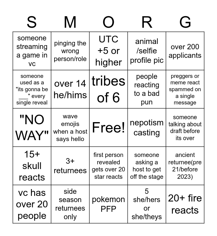 This bingo card has a free space and 24 words: 3+ returnees, side season returnees only, tribes of 6, vc has over 20 people, over 200 applicants, someone streaming a game in vc, someone used as a "its gonna be ___" every single reveal, pinging the wrong person/role, nepotism casting, first person revealed gets over 20 star reacts, people reacting to a bad pun, "NO WAY", someone asking a host to get off the stage, ancient returnee(pre 21/before 2023), over 14 he/hims, 5 she/hers or she/theys, someone talking about draft before its over, UTC +5 or higher, preggers or meme react spammed on a single message, wave emojis when a host says hello, 20+ fire reacts, 15+ skull reacts, animal /selfie profile pic and pokemon PFP.