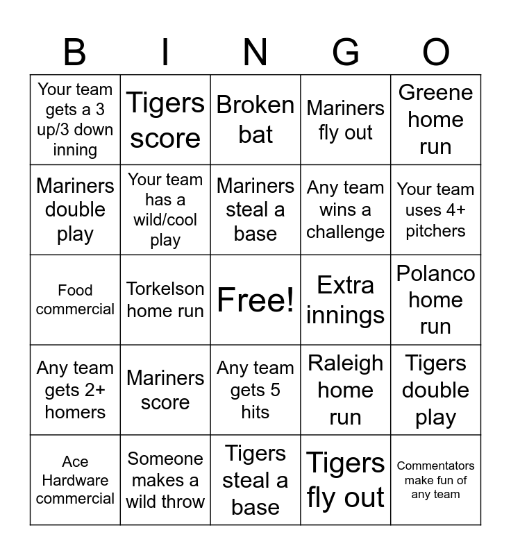 This bingo card has a free space and 24 words: Mariners score, Someone makes a wild throw, Mariners steal a base, Ace Hardware commercial, Greene home run, Your team gets a 3 up/3 down inning, Mariners double play, Tigers score, Extra innings, Any team gets 5 hits, Any team wins a challenge, Food commercial, Raleigh home run, Tigers double play, Your team has a wild/cool play, Tigers fly out, Polanco home run, Broken bat, Your team uses 4+ pitchers, Torkelson home run, Commentators make fun of any team, Any team gets 2+ homers, Mariners fly out and Tigers steal a base.