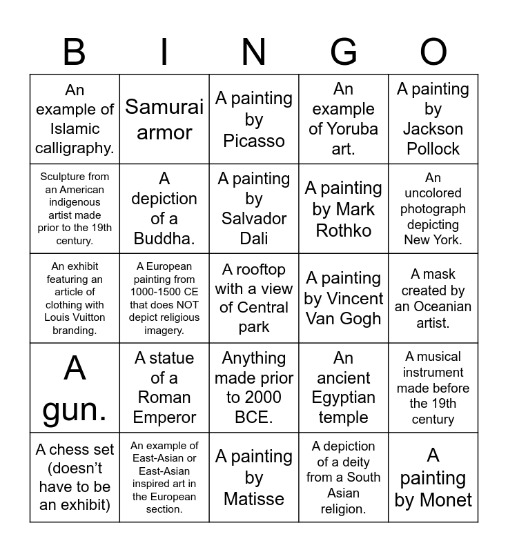 This bingo card has a free space and 24 words: A statue of a Roman Emperor, An example of East-Asian or East-Asian inspired art in the European section., A painting by Salvador Dali, A chess set (doesn’t have to be an exhibit), A painting by Jackson Pollock, An example of Islamic calligraphy., Sculpture from an American indigenous artist made prior to the 19th century., Samurai armor, A painting by Vincent Van Gogh, Anything made prior to 2000 BCE., A painting by Mark Rothko, An exhibit featuring an article of clothing with Louis Vuitton branding., An ancient Egyptian temple, A musical instrument made before the 19th century, A depiction of a Buddha., A depiction of a deity from a South Asian religion., A mask created by an Oceanian artist., A painting by Picasso, An uncolored photograph depicting New York., A European painting from 1000-1500 CE that does NOT depict religious imagery., A painting by Monet, A gun., An example of Yoruba art. and A painting by Matisse.