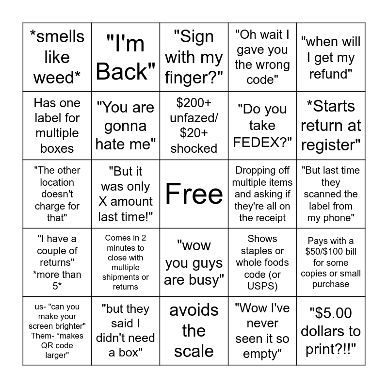 This bingo card has a free space and 24 words: Comes in 2 minutes to close with multiple shipments or returns, "but they said I didn't need a box", $200+ unfazed/ $20+ shocked, us- "can you make your screen brighter" Them- *makes QR code larger", "when will I get my refund", *smells like weed*, Has one label for multiple boxes, "I'm Back", Dropping off multiple items and asking if they're all on the receipt, "wow you guys are busy", "Do you take FEDEX?", "The other location doesn't charge for that", Shows staples or whole foods code (or USPS), Pays with a $50/$100 bill for some copies or small purchase, "You are gonna hate me", "Wow I've never seen it so empty", "But last time they scanned the label from my phone", "Sign with my finger?", *Starts return at register", "But it was only X amount last time!", "$5.00 dollars to print?!!", "I have a couple of returns" *more than 5*, "Oh wait I gave you the wrong code" and avoids the scale.