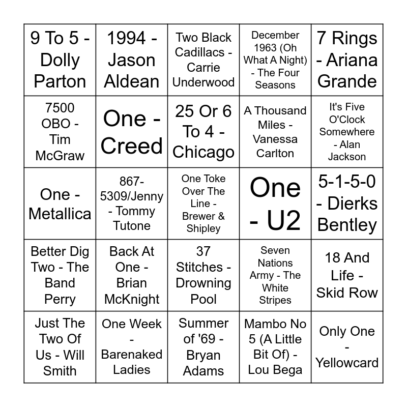 This bingo card has 64 words: 100 In A 55 - Pop Evil, 1000hp - Godsmack, 1, 2 Step - Ciara, 18 And Life - Skid Row, 18 Days - Saving Abel, 1979 - Smashing Pumpkins, 1994 - Jason Aldean, 21 Guns - Green Day, 25 Or 6 To 4 - Chicago, 3 AM - Matchbox 20, 37 Stitches - Drowning Pool, 45 - Shinedown, 5-1-5-0 - Dierks Bentley, 7 Rings - Ariana Grande, 7 Summers - Morgan Wallen, 7500 OBO - Tim McGraw, 867-5309/Jenny - Tommy Tutone, 9 To 5 - Dolly Parton, 99 Red Balloons - Nena, A Thousand Miles - Vanessa Carlton, Back At One - Brian McKnight, Better Dig Two - The Band Perry, December 1963 (Oh What A Night) - The Four Seasons, Edge Of Seventeen - Stevie Nicks, Fifteen - Taylor Swift, Five More Minutes - Scotty McCreery, Forty Six & 2 - Tool, Funk #49 - James Gang, Gimme Three Steps - Lynyrd Skynyrd, Highway 20 Ride - Zac Brown Band, I Can't Drive 55 - Sammy Hagar, I Got 5 On It - Luniz, If I Had $1000000 - Barenaked Ladies, It Takes Two - Rob Base & DJ E-Z Rock, It's Five O'Clock Somewhere - Alan Jackson, Just The Two Of Us - Will Smith, Knock Three Times - Tony Orlando & Dawn, Mambo No 5 (A Little Bit Of) - Lou Bega, Number One Spot - Ludacris, One - Creed, One - Metallica, One - U2, One Margarita - Luke Bryan, One More Time - Daft Punk, One Thing - Finger Eleven, One Toke Over The Line - Brewer & Shipley, One Week - Barenaked Ladies, Only One - Yellowcard, Seven Nations Army - The White Stripes, Seventeen - Winger, Song #3 - Stone Sour, Song 2 - Blur, Summer of '69 - Bryan Adams, Ten Thousand Fists - Disturbed, Three Little Birds - Bob Marley & The Wailers, Three Wooden Crosses - Randy Travis, Two Black Cadillacs - Carrie Underwood, Two Of A Kind, Workin' On A Full House - Garth Brooks, Two Of Hearts - Stacey Q, Two Out Of Three Ain't Bad - Meat Loaf, Two Princes - Spin Doctors, Two Tickets To Paradise - Eddie Money, Zero - Smashing Pumpkins and 4x4 - Lainey Wilson.