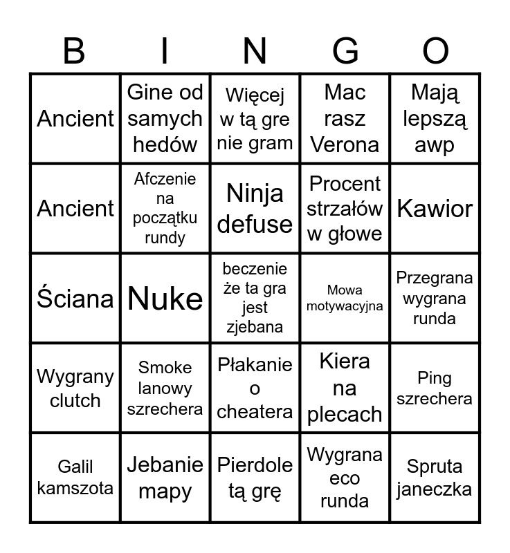 This bingo card has 25 words: Smoke lanowy szrechera, Pierdole tą grę, Ninja defuse, Galil kamszota, Mają lepszą awp, Ancient, Ancient, Gine od samych hedów, Mowa motywacyjna, Płakanie o cheatera, Procent strzałów w głowe, Ściana, Kiera na plecach, Ping szrechera, Afczenie na początku rundy, Spruta janeczka, Przegrana wygrana runda, Więcej w tą gre nie gram, Kawior, Nuke, beczenie że ta gra jest zjebana, Jebanie mapy, Wygrany clutch, Mac rasz Verona and Wygrana eco runda.