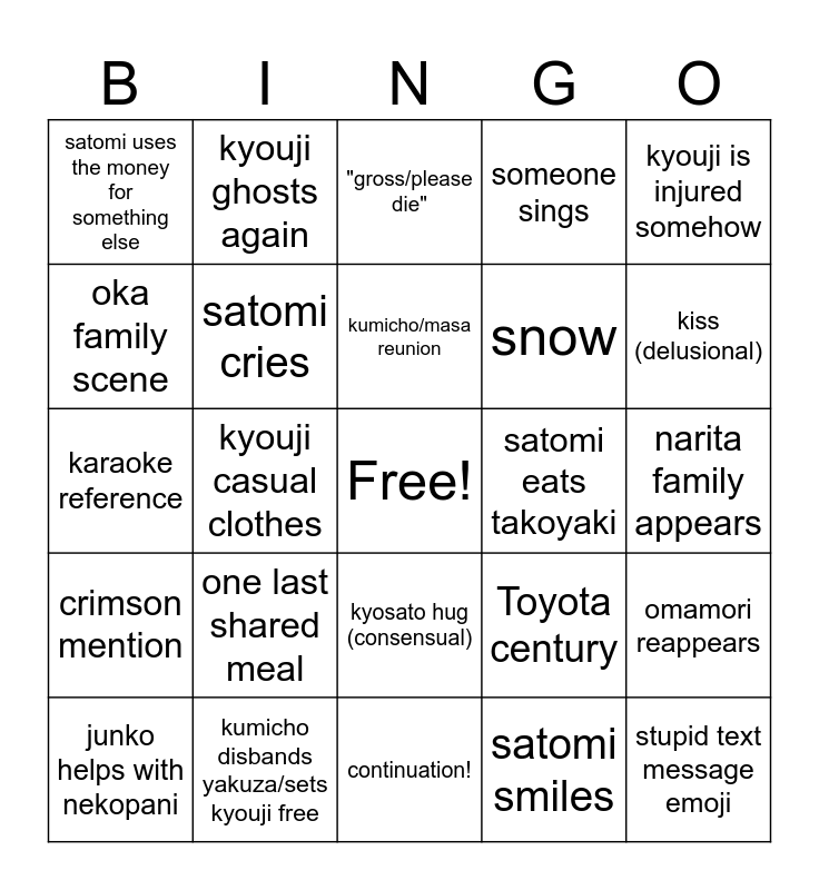 This bingo card has a free space and 24 words: one last shared meal, kumicho disbands yakuza/sets kyouji free, kumicho/masa reunion, junko helps with nekopani, kyouji is injured somehow, satomi uses the money for something else, oka family scene, kyouji ghosts again, satomi eats takoyaki, kyosato hug (consensual), snow, karaoke reference, Toyota century, omamori reappears, satomi cries, satomi smiles, narita family appears, "gross/please die", kiss (delusional), kyouji casual clothes, stupid text message emoji, crimson mention, someone sings and continuation!.