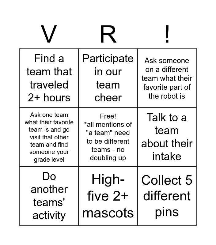 This bingo card has a free space and 8 words: Talk to a team about their intake, Ask someone on a different team what their favorite part of the robot is, Participate in our team cheer, Do another teams' activity, Find a team that traveled 2+ hours, Collect 5 different pins, Ask one team what their favorite team is and go visit that other team and find someone your grade level and High-five 2+ mascots.
