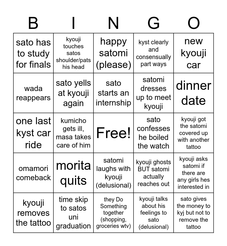 This bingo card has a free space and 24 words: morita quits, time skip to satos uni graduation, sato starts an internship, kyouji removes the tattoo, new kyouji car, sato has to study for finals, wada reappears, kyouji touches satos shoulder/pats his head, sato confesses he boiled the watch, satomi laughs with kyouji (delusional), satomi dresses up to meet kyouji, one last kyst car ride, kyouji ghosts BUT satomi actually reaches out, kyouji asks satomi if there are any girls hes interested in, sato yells at kyouji again, kyouji talks about his feelings to sato (delusional), kyouji got the satomi covered up with another tattoo, happy satomi (please), dinner date, kumicho gets ill, masa takes care of him, sato gives the money to kyj but not to remove the tattoo, omamori comeback, kyst clearly and consensually part ways and they Do Something together (shopping, groceries wtv).
