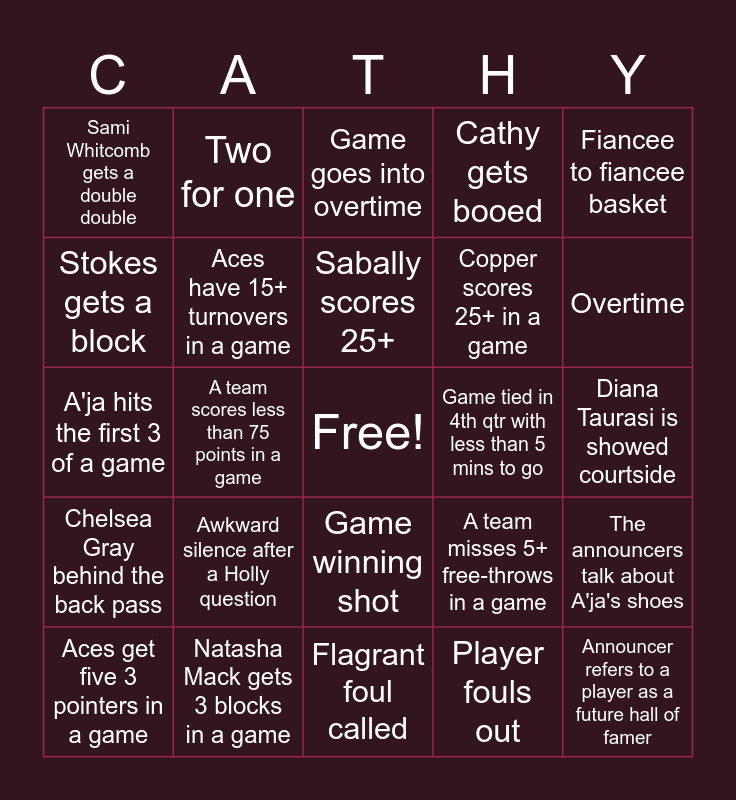 This bingo card has a free space and 101 words: Someone else in discord complains about a commercial, NBA man's appearance is celebrated, Fiancee to fiancee basket, Ryan & Rebecca need to get a room, Elle Duncan quotes a song, "AT tore both labrums", Becky Techy, Ryan Ruocco unintentional double entendre, Mark Davis attends the Aces game instead of the Raiders game (Game 2 only), Media trying to force a rivarly, Caitlin Clark Commercial, Holly says something she read on Instagram as if she got it because she's BFF with each player, Lobo says "certainly", B'am gets mentioned when they are talking about A'ja, AT gets a triple double, Someone other than AT gets a triple double first, Chelsea Gray behind the back pass, Becky wears a bedazzled blazer, Audio gets cut from an in-game interview, Aces don't involve A'ja in a drawn up play at a pivotal moment in the game, Carolyn Peck fails to hide the fact that the Aces are her favorite, "Pay Them" chant, "Both coaches have NBA experience", KB shoots 3 points, "Bigshot Bonner", Overtime, Cathy gets booed, Awkward silence after a Holly question, Girldad challenges a call, AT triple double in a Mercury loss, Two for one, Game goes into overtime, Tie game going into the 4th qtr, Back to Back 3 pointers by the same team, Buzzer beater shot to end a qtr, Game winning shot, Double double performance, Triple double performance, Player fouls out, Flagrant foul called, A'ja Wilson scores 30+, Aces get five 3 pointers in a game, Mercury get five 3 pointers in a game, Aces go on a 10-0 run, Mercury go on a 10-0 run, Announcer refers to a player as a future hall of famer, Announcer mentions the tv ratings growth, Chelsea Gray no look pass, K. Bell hits a 3 pointer, Whitcomb hits the first 3 of a game, Gustafson hits a 3, Stokes gets a block, AT draws a charge, Copper hits three 3's in a game, AT gets a double double in the first half, Chelsea Gray gets 10+ assist in a game, Dana Evans gets three 3 pointers in a half, Aces score 100+ in a game, Mercury score 100+ in a game, Jewell Loyd hits four 3 pointers in a game, Aces have 15+ turnovers in a game, Mercury have 15+ turnovers in a game, A foul is called in the firs 45 seconds of a game, Chelsea Gray scores the first points of a game, Kahleah Copper scores the first points of a game, Copper scores 25+ in a game, Bonner gets a double double, A team scores less than 75 points in a game, Natasha Mack gets 3 blocks in a game, Kathryn Westbeld scores 10+ in a game, Nate Tibbets gets T'd up, Monique Akoa Makani scores 10+ in a game, Sami Whitcomb gets a double double, Caitlin Clark is mentioned at least twice by the announcers during a game., Sabally scores 25+, A'ja hits the first 3 of a game, AT hits a 3, DeWanna Bonner gets a double double, Satou Sabally charged with a reckless closeout, Aces get a 20+ point lead in a game, Mercury get a 20+ point lead in a game, A team wins by 15+, Game tied in 4th qtr with less than 5 mins to go, Dana Evans gets a steal, Kahleah Copper gets a steal, Kehlani is showed courtside, Diana Taurasi is showed courtside, Devin Booker is showed courtside, Any of the NFL Raiders are showed courtside, The announcer mentions coaches being fined, A team misses 5+ free-throws in a game, A player gets ejected in a game, A coach gets ejected in a game, A kid with glasses is shown dancing during a game, Aces sweep the series, The announcers talk about A'ja's shoes, Jackie Young wins Finals MVP, AT Wins Finals MVP, Jackie Young hits four 3's in a game, Chelsea Gray draws a charge and A team wins by less than 5 points.