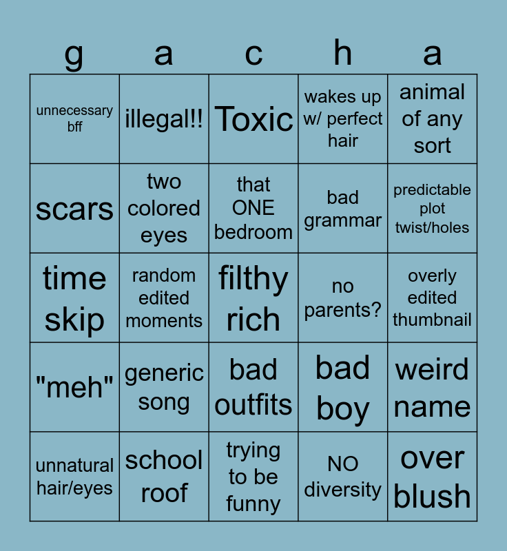 This bingo card has a free space and 24 words: generic song, school roof, that ONE bedroom, unnatural hair/eyes, animal of any sort, unnecessary bff, scars, illegal!!, no parents?, bad outfits, bad grammar, time skip, bad boy, weird name, two colored eyes, NO diversity, overly edited thumbnail, Toxic, predictable plot twist/holes, random edited moments, over blush, "meh", wakes up w/ perfect hair and trying to be funny.
