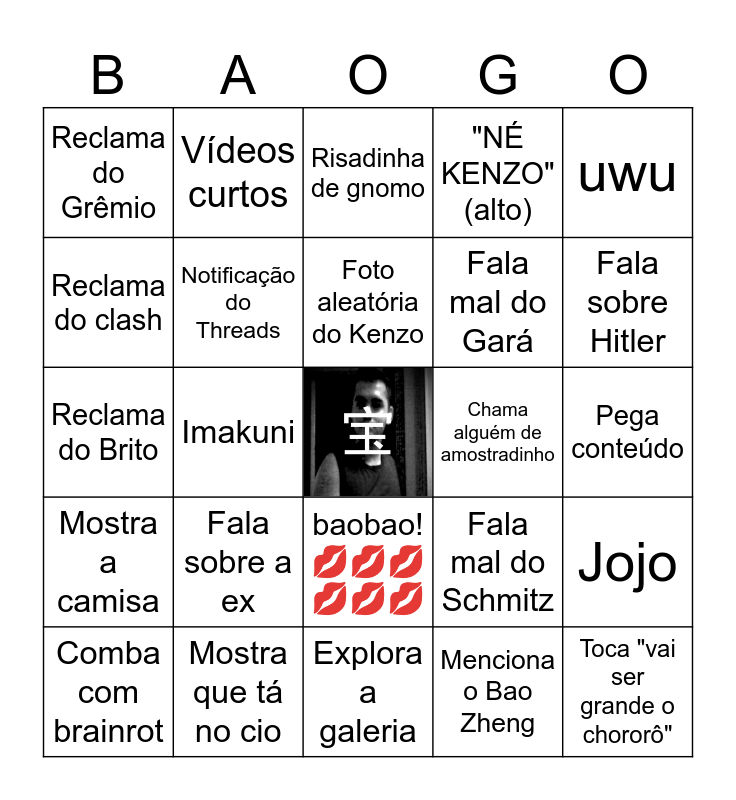 This bingo card has a free space and 24 words: Fala sobre a ex, Mostra que tá no cio, Foto aleatória do Kenzo, Comba com brainrot, uwu, Reclama do Grêmio, Reclama do clash, Vídeos curtos, Chama alguém de amostradinho, baobao! 💋💋💋💋💋💋, Fala mal do Gará, Reclama do Brito, Fala mal do Schmitz, Jojo, Notificação do Threads, Menciona o Bao Zheng, Pega conteúdo, Risadinha de gnomo, Fala sobre Hitler, Imakuni, Toca "vai ser grande o chororô", Mostra a camisa, "NÉ KENZO"(alto) and Explora a galeria.