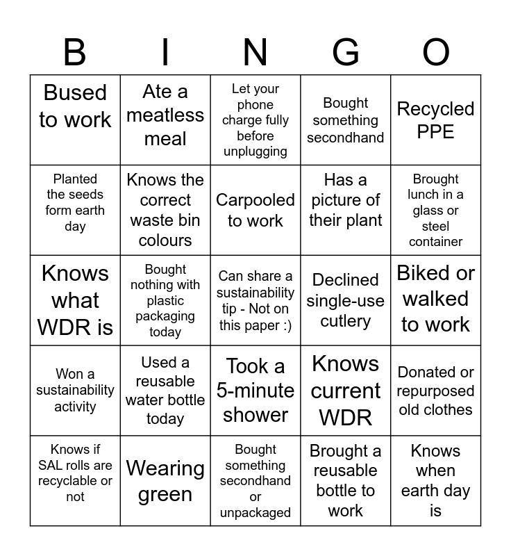 This bingo card has 25 words: Used a reusable water bottle today, Bought something secondhand or unpackaged, Carpooled to work, Knows if SAL rolls are recyclable or not, Recycled PPE, Bused to work, Planted the seeds form earth day, Ate a meatless meal, Declined single-use cutlery, Took a 5-minute shower, Has a picture of their plant, Knows what WDR is, Knows current WDR, Donated or repurposed old clothes, Knows the correct waste bin colours, Knows when earth day is, Biked or walked to work, Let your phone charge fully before unplugging, Brought lunch in a glass or steel container, Bought nothing with plastic packaging today, Can share a sustainability tip - Not on this paper :), Wearing green, Won a sustainability activity, Bought something secondhand and Brought a reusable bottle to work.