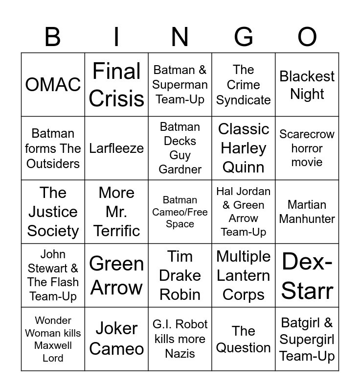 This bingo card has a free space and 24 words: Green Arrow, Joker Cameo, Batman Decks Guy Gardner, Wonder Woman kills Maxwell Lord, Blackest Night, OMAC, Batman forms The Outsiders, Final Crisis, Hal Jordan & Green Arrow Team-Up, Tim Drake Robin, Classic Harley Quinn, The Justice Society, Multiple Lantern Corps, Dex-Starr, Larfleeze, The Question, Martian Manhunter, Batman & Superman Team-Up, Scarecrow horror movie, More Mr. Terrific, Batgirl & Supergirl Team-Up, John Stewart & The Flash Team-Up, The Crime Syndicate and G.I. Robot kills more Nazis.