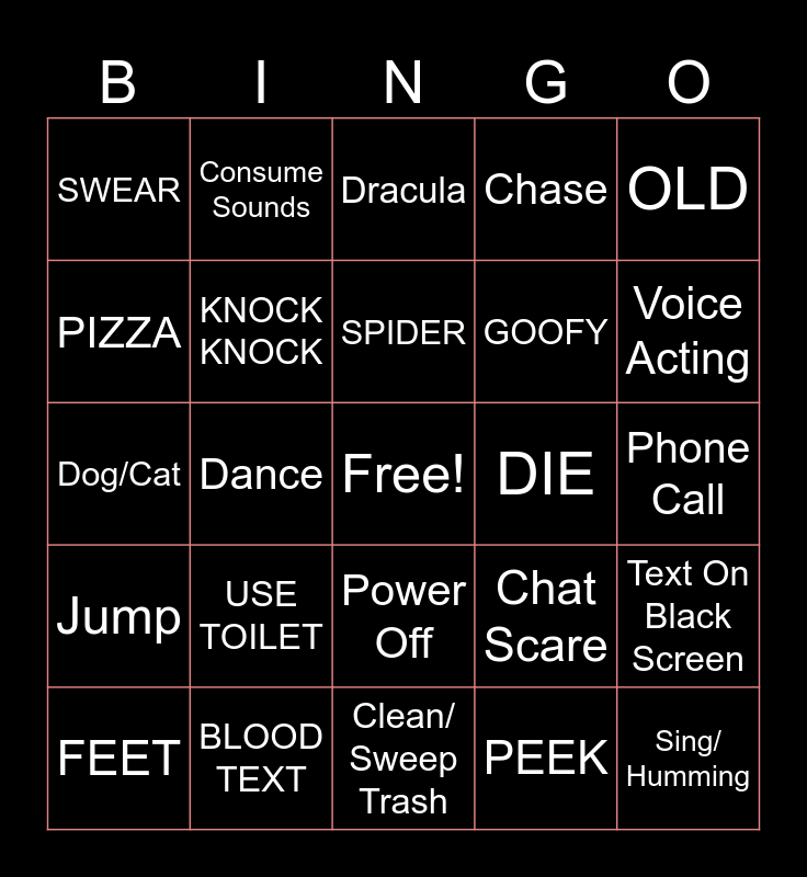 This bingo card has a free space and 24 words: USE TOILET, BLOOD TEXT, SPIDER, FEET, OLD, SWEAR, PIZZA, Consume Sounds, DIE, Power Off, GOOFY, Dog/Cat, Chat Scare, Text On Black Screen, KNOCK KNOCK, PEEK, Phone Call, Dracula, Voice Acting, Dance, Sing/ Humming, Jump, Chase and Clean/ Sweep Trash.