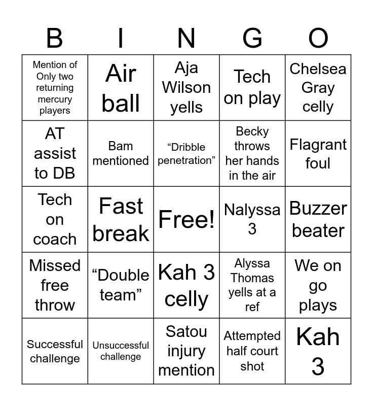 This bingo card has a free space and 27 words: Alyssa Thomas yells at a ref, Nate gets mad at a ref, Becky throws her hands in the air, Satou injury mention, AT assist to DB, Aja Wilson yells, Air ball, Missed free throw, Nalyssa 3, We on go plays, Tech on coach, Tech on play, Successful challenge, Unsuccessful challenge, Flagrant foul, Celeb sighting, Bam mentioned, “Dribble penetration”, “Double team”, Mention of Only two returning mercury players, Buzzer beater, Attempted half court shot, Fast break, Kah 3, Kah 3 celly, Chelsea Gray celly and “The engine”.