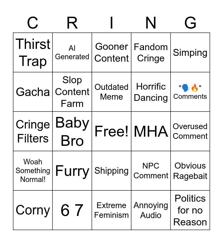 This bingo card has a free space and 24 words: Furry, 6 7, Outdated Meme, Corny, Simping, Thirst Trap, Gacha, AI Generated, MHA, Shipping, Horrific Dancing, Cringe Filters, NPC Comment, Obvious Ragebait, Slop Content Farm, Annoying Audio, Overused Comment, Gooner Content, "🗣🔥" Comments, Baby Bro, Politics for no Reason, Woah Something Normal!, Fandom Cringe and Extreme Feminism.
