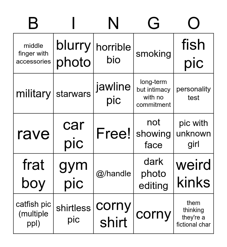 This bingo card has a free space and 24 words: gym pic, shirtless pic, jawline pic, catfish pic (multiple ppl), fish pic, middle finger with accessories, military, blurry photo, not showing face, @/handle, long-term but intimacy with no commitment, rave, dark photo editing, weird kinks, starwars, corny, pic with unknown girl, horrible bio, personality test, car pic, them thinking they're a fictional char, frat boy, smoking and corny shirt.