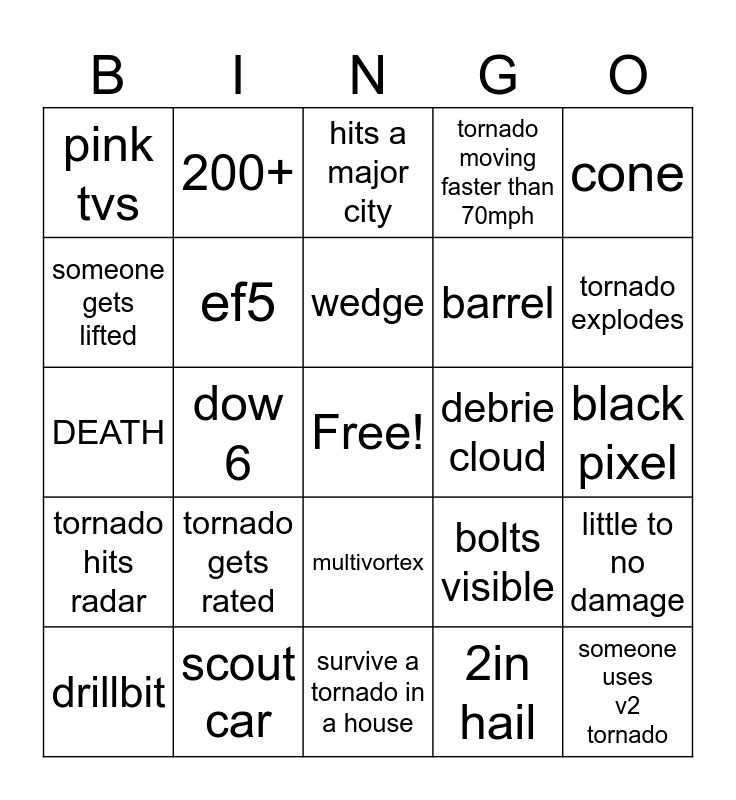 This bingo card has a free space and 24 words: tornado gets rated, scout car, wedge, drillbit, cone, pink tvs, someone gets lifted, 200+, debrie cloud, multivortex, barrel, DEATH, bolts visible, little to no damage, ef5, 2in hail, black pixel, hits a major city, tornado explodes, dow 6, someone uses v2 tornado, tornado hits radar, tornado moving faster than 70mph and survive a tornado in a house.