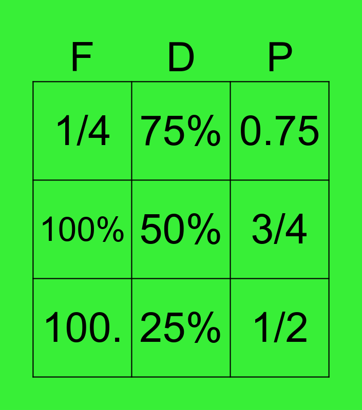 This bingo card has 12 words: 0.5, 1/2, 50%, 3/4, 75%, 0.75, 25%, 0.25, 1/4, 100%, 100. and 100/1.