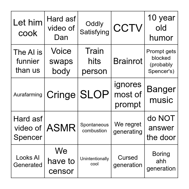 This bingo card has a free space and 24 words: ASMR, We have to censor, Train hits person, Looks AI Generated, 10 year old humor, Let him cook, The AI is funnier than us, Hard asf video of Dan, ignores most of prompt, Spontaneous combustion, Brainrot, Aurafarming, We regret generating, do NOT answer the door, Voice swaps body, Cursed generation, Banger music, Oddly Satisfying, Prompt gets blocked (probably Spencer's), Cringe, Boring ahh generation, Hard asf video of Spencer, CCTV and Unintentionally cool.