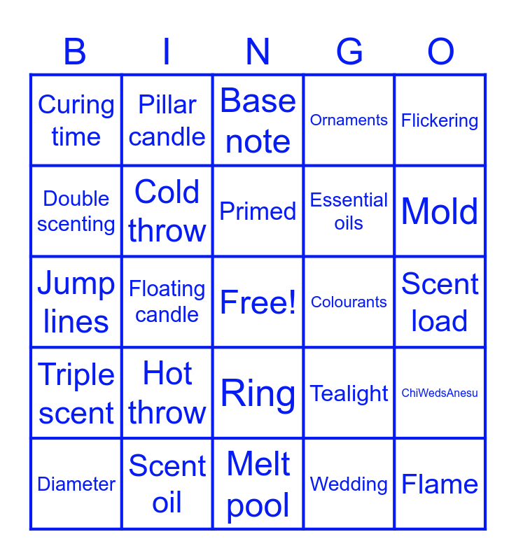 This bingo card has a free space and 82 words: Additive, Afterglow, Base note, Beeswax, Bottom note, Burn rate, Candle, Candle jar, Candleholder, Candlelight, Chandler, Coconut wax, Cold throw, Colourants, Coreless, Curing time, Diameter, Double scenting, Drowning out, Dry flowers, Dye, Essential oils, Flame, Flickering, Floating candle, Fragrance load, Fragrance notes, Frosting, Glitter, Hanukkah, Hot throw, Hurricane candle, Jump lines, Light, Melt point, Melt pool, Middle note, Mix temperature, Mold, Mold plug, Mold sealer, Ornaments, Out of Bottle (OOB), Palm wax, Paraffin wax, Pillar candle, Pour temperature, Primed, Rate of Consumption (ROC), Repour, Scent, Scent load, Scent oil, Scent throw, Scented candles, Soy wax, Soy wick, Stabilising bar, Synthetic oil, Tealight, Top note, Top pour wax, Triple scent, Vessel, Votive candle, Wax, Wax melting pot, Wet spots, Wick, Wick bar, Wickless, Bride, Ring, Wedding, Love, Romance, Union, Veil, Celebrate, RealTalksWithChi, ChiWedsAnesu and Aurora.