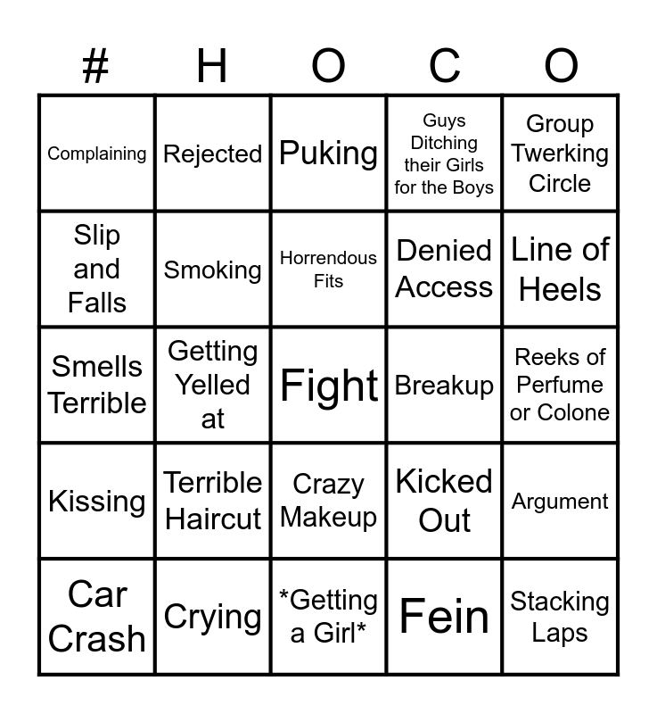 This bingo card has 25 words: Kissing, Crying, Fight, Fein, Group Twerking Circle, Complaining, Rejected, Puking, Breakup, Argument, Slip and Falls, Smoking, *Getting a Girl*, Kicked Out, Line of Heels, Car Crash, Getting Yelled at, Horrendous Fits, Denied Access, Reeks of Perfume or Colone, Smells Terrible, Terrible Haircut, Crazy Makeup, Guys Ditching their Girls for the Boys and Stacking Laps.