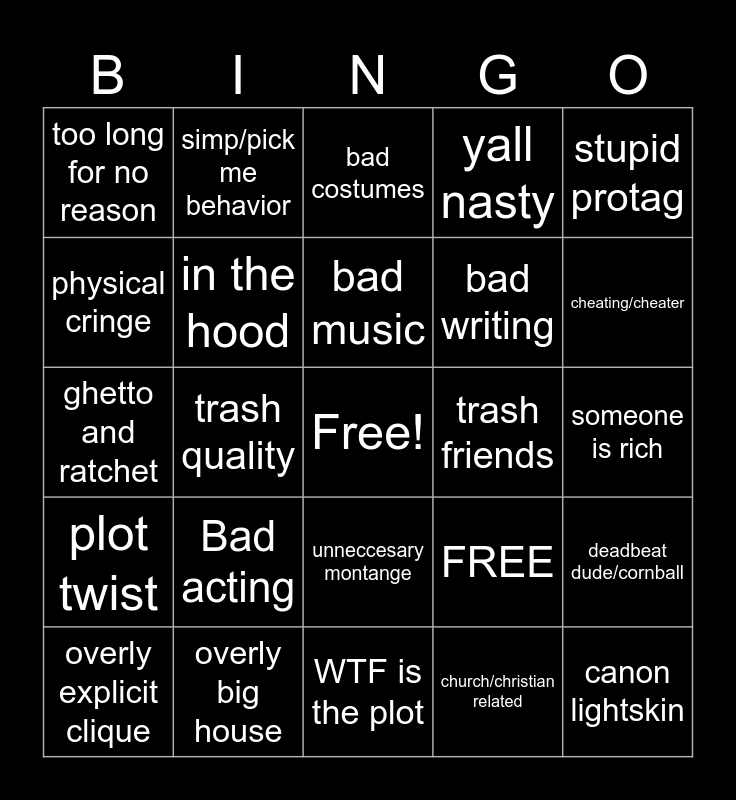 This bingo card has a free space and 25 words: Bad acting, WTF is the plot, bad music, overly explicit clique, stupid protag, too long for no reason, physical cringe, simp/pick me behavior, trash friends, unneccesary montange, bad writing, ghetto and ratchet, FREE, deadbeat dude/cornball, in the hood, random kid/children, someone is rich, bad costumes, cheating/cheater, trash quality, canon lightskin, overly big house, plot twist, yall nasty and church/christian related.