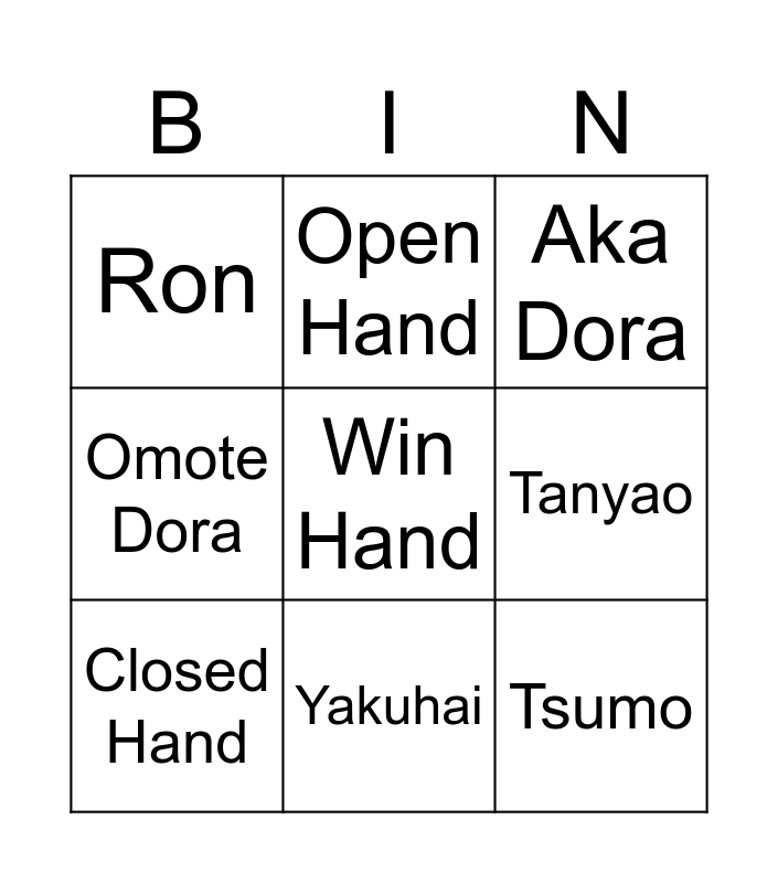 This bingo card has a free space and 8 words: Tanyao, Aka Dora, Open Hand, Closed Hand, Ron, Tsumo, Omote Dora and Yakuhai.