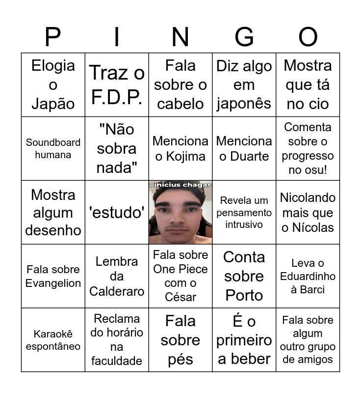 This bingo card has a free space and 24 words: Lembra da Calderaro, Reclama do horário na faculdade, Menciona o Kojima, Karaokê espontâneo, Mostra que tá no cio, Elogia o Japão, Soundboard humana, Traz o F.D.P., Revela um pensamento intrusivo, Fala sobre One Piece com o César, Menciona o Duarte, Mostra algum desenho, Conta sobre Porto, Leva o Eduardinho à Barci, "Não sobra nada", É o primeiro a beber, Nicolando mais que o Nícolas, Fala sobre o cabelo, Comenta sobre o progresso no osu!, 'estudo', Fala sobre algum outro grupo de amigos, Fala sobre Evangelion, Diz algo em japonês and Fala sobre pés.