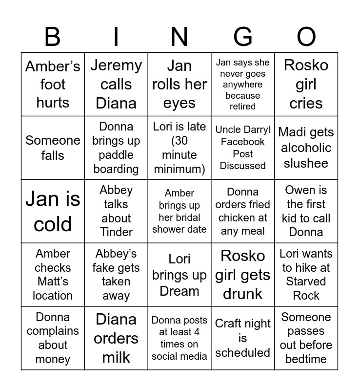 This bingo card has a free space and 24 words: Abbey’s fake gets taken away, Diana orders milk, Lori is late (30 minute minimum), Donna complains about money, Rosko girl cries, Amber’s foot hurts, Someone falls, Jeremy calls Diana, Donna orders fried chicken at any meal, Lori brings up Dream, Uncle Darryl Facebook Post Discussed, Jan is cold, Rosko girl gets drunk, Lori wants to hike at Starved Rock, Donna brings up paddle boarding, Craft night is scheduled, Owen is the first kid to call Donna, Jan rolls her eyes, Madi gets alcoholic slushee, Abbey talks about Tinder, Someone passes out before bedtime, Amber checks Matt’s location, Jan says she never goes anywhere because retired and Donna posts at least 4 times on social media.
