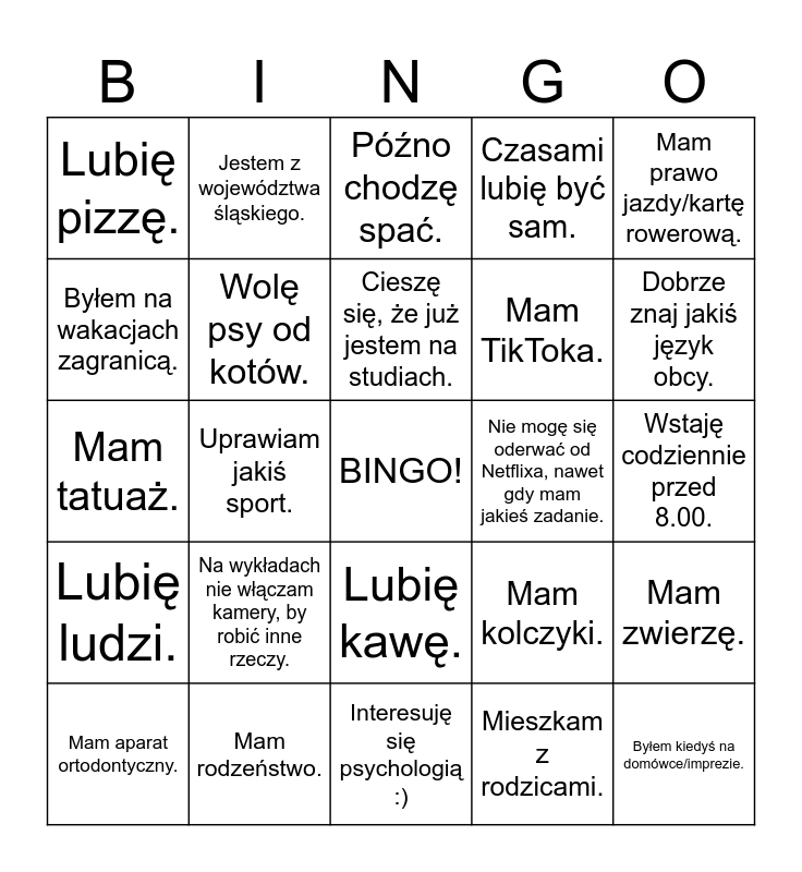 This bingo card has a free space and 24 words: Na wykładach nie włączam kamery, by robić inne rzeczy., Mam rodzeństwo., Cieszę się, że już jestem na studiach., Mam aparat ortodontyczny., Mam prawo jazdy/kartę rowerową., Lubię pizzę., Byłem na wakacjach zagranicą., Jestem z województwa śląskiego., Nie mogę się oderwać od Netflixa, nawet gdy mam jakieś zadanie., Lubię kawę., Mam TikToka., Mam tatuaż., Mam kolczyki., Mam zwierzę., Wolę psy od kotów., Mieszkam z rodzicami., Wstaję codziennie przed 8.00., Późno chodzę spać., Dobrze znaj jakiś język obcy., Uprawiam jakiś sport., Byłem kiedyś na domówce/imprezie., Lubię ludzi., Czasami lubię być sam. and Interesuję się psychologią :).