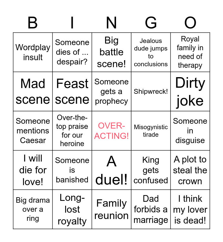 This bingo card has a free space and 44 words: Cross-dressing, I think my lover is dead!, Mix-up with a sleeping potion, Big drama over a ring, Villain soliloquises about his evil plan, Dad forbids a marriage, Big battle scene!, A letter is misleading, Royal family in need of therapy, Long-lost royalty, Jealous dude jumps to conclusions, Misogynistic tirade, A duel!, Someone is banished, Hey, they're not actually dead!, Family reunion, Someone mentions Jupiter, Someone mentions Caesar, Someone won't shut up about being in love, Dirty joke, Someone dies of ... despair?, We're in Rome!, "I am your father" reveal, Wordplay insult, Music break, Someone in disguise, Servant is more sensible than their boss, Running away from court, King gets confused, I will die for love!, My wife cheated on me! (Except she didn't), A plot to steal the crown, Exposition dump, Body part gets chopped off, Over-the-top praise for our heroine, Scene ends with a rhyming couplet, Overly long death speech, A ghost appears, Someone gets a prophecy, Mad scene, Shipwreck!, They have a twin?!, Feast scene and Someone is drunk.