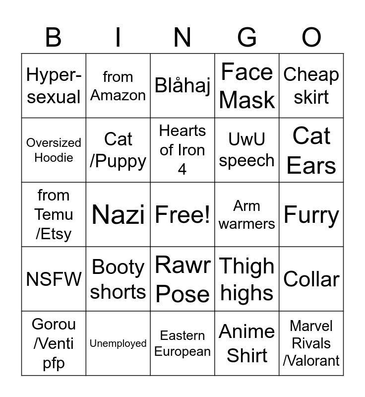 This bingo card has a free space and 24 words: Booty shorts, Unemployed, Hearts of Iron 4, Gorou /Venti pfp, Cheap skirt, Hyper-sexual, Oversized Hoodie, from Amazon, Arm warmers, Rawr Pose, UwU speech, from Temu /Etsy, Thigh highs, Collar, Cat /Puppy, Anime Shirt, Furry, Blåhaj, Cat Ears, Nazi, Marvel Rivals /Valorant, NSFW, Face Mask and Eastern European.