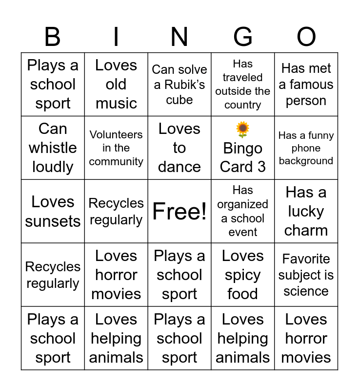 This bingo card has a free space and 259 words: Has a pet cat or dog, Plays a school sport, Loves spicy food, Loves sunsets, Loves to dance, Has an older sibling, Knows how to cook, Volunteers in the community, Has met a famous person, Loves helping animals, Can solve a Rubik’s cube, Favorite subject is science, Loves horror movies, Plays video games, Has broken a bone, Has taken a CPR course, Has a lucky charm, Can quote a meme, Loves mentoring younger students, Loves old music, Has a funny phone background, Has been to Disney World, Can play a musical instrument, Loves to nap, Recycles regularly, 🌈 Bingo Card 2, Loves spicy food, Has a pet cat or dog, Can play a musical instrument, Plays video games, Loves mentoring younger students, Has broken a bone, Loves old music, Loves sunsets, Has been to Disney World, Has met a famous person, Volunteers in the community, Favorite subject is science, Knows how to cook, Has organized a school event, Loves to dance, Has taken a CPR course, Can whistle loudly, Loves horror movies, Has an older sibling, Plays a school sport, Has attended a leadership event, Recycles regularly, Can quote a meme, Has a funny phone background, Loves to nap, 🌻 Bingo Card 3, Has traveled outside the country, Has a lucky charm, Loves helping animals, Loves spicy food, Volunteers in the community, Plays video games, Can solve a Rubik’s cube, Loves to dance, Has a pet cat or dog, Has met a famous person, Has a funny phone background, Loves mentoring younger students, Loves sunsets, Has taken a CPR course, Favorite subject is science, Loves old music, Plays a school sport, Loves horror movies, Has organized a school event, Knows how to cook, Can play a musical instrument, Loves public speaking, Has been to Disney World, Can quote a meme, Recycles regularly, 🌼 Bingo Card 4, Can quote a meme, Loves to nap, Has met a famous person, Has broken a bone, Volunteers in the community, Loves sunsets, Can whistle loudly, Plays a school sport, Loves old music, Loves mentoring younger students, Favorite subject is science, Loves horror movies, Has a pet cat or dog, Loves to dance, Has attended a leadership event, Knows how to cook, Recycles regularly, Has a funny phone background, Loves helping animals, Loves public speaking, Has organized a school event, Has a lucky charm, Has taken a CPR course, Plays video games, Loves spicy food, ☀️ Bingo Card 5, Has traveled outside the country, Can solve a Rubik’s cube, Plays a school sport, Loves helping animals, Loves horror movies, Loves sunsets, Loves to dance, Has been to Disney World, Has taken a CPR course, Has broken a bone, Volunteers in the community, Can play a musical instrument, Loves old music, Has a lucky charm, Has attended a leadership event, Favorite subject is science, Loves mentoring others, Recycles regularly, Can whistle loudly, Loves spicy food, Has organized a school event, Has a pet cat or dog, Has a funny phone background, Knows how to cook, Loves to nap, 🌟 Bingo Card 6, Has met a famous person, Loves public speaking, Loves sunsets, Plays a school sport, Loves spicy food, Has a pet cat or dog, Loves helping animals, Loves mentoring others, Loves old music, Volunteers in the community, Has organized a school event, Can whistle loudly, Has taken a CPR course, Has traveled abroad, Can solve a Rubik’s cube, Knows how to cook, Has attended a leadership event, Loves horror movies, Has a lucky charm, Recycles regularly, Has a funny phone background, Plays video games, Can quote a meme, Loves to nap, Favorite subject is science, 💫 Bingo Card 7, Loves helping animals, Has met a famous person, Has a pet cat or dog, Loves horror movies, Loves spicy food, Has a funny phone background, Plays video games, Loves sunsets, Volunteers in the community, Loves mentoring others, Loves old music, Has attended a leadership event, Can play a musical instrument, Loves public speaking, Has taken a CPR course, Has a lucky charm, Can solve a Rubik’s cube, Favorite subject is science, Has organized a school event, Plays a school sport, Has traveled outside the country, Loves to dance, Recycles regularly, Can whistle loudly, Loves to nap, 🌸 Bingo Card 8, Has an older sibling, Loves old music, Loves to dance, Loves helping animals, Volunteers in the community, Loves mentoring others, Plays a sport, Can whistle loudly, Loves sunsets, Has attended a leadership event, Favorite subject is science, Loves spicy food, Has a pet cat or dog, Has organized a school event, Can play a musical instrument, Loves horror movies, Has taken a CPR course, Can solve a Rubik’s cube, Has a funny phone background, Recycles regularly, Has met a famous person, Loves to nap, Has been to Disney World, Knows how to cook, Loves public speaking, 🌿 Bingo Card 9, Loves to dance, Has organized a school event, Loves sunsets, Loves helping animals, Has met a famous person, Loves mentoring others, Plays video games, Can quote a meme, Loves horror movies, Loves spicy food, Has a pet cat or dog, Favorite subject is science, Has taken a CPR course, Loves old music, Has a funny phone background, Can whistle loudly, Plays a school sport, Has been to Disney World, Has a lucky charm, Volunteers in the community, Has broken a bone, Loves public speaking, Loves to nap, Recycles regularly, Can solve a Rubik’s cube, 🌼 Bingo Card 10, Has traveled outside the country, Loves helping animals, Loves sunsets, Loves to dance, Has met a famous person, Plays a sport, Loves mentoring younger students, Loves spicy food, Has organized a school event, Has attended a leadership event, Volunteers in the community, Loves old music, Has taken a CPR course, Can solve a Rubik’s cube, Favorite subject is science, Can quote a meme, Has a pet cat or dog, Loves horror movies, Plays video games, Recycles regularly, Has a funny phone background, Loves to nap, Has a lucky charm, Can play a musical instrument and Loves public speaking.
