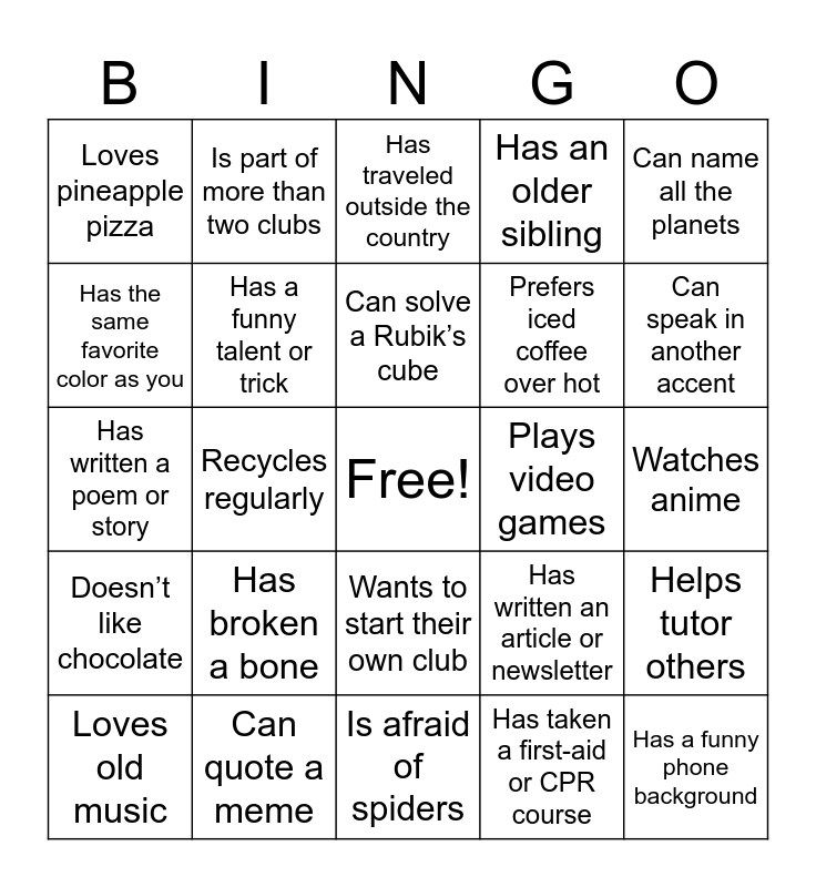 This bingo card has a free space and 80 words: Has a pet cat or dog, Plays a school sport, Has traveled outside the country, Can play a musical instrument, Favorite subject is science, Has a birthday this month, Knows how to cook, Speaks more than one language, Is left-handed, Loves to read, Has met a famous person, Can whistle loudly, Has an older sibling, Loves pineapple pizza, Walks or bikes to school, Has the same favorite color as you, Volunteers in the community, Has broken a bone, Has been to a concert, Watches anime, Can draw or paint, Can name all the planets, Has written a poem or story, Can solve a Rubik’s cube, Has a funny talent or trick, Loves to dance, Can recite a movie quote, Wears mismatched socks, Loves spicy food, Has a favorite TikTok trend, Can speak in another accent, Has a collection, Is afraid of spiders, Has a lucky charm, Loves old music, Plays video games, Knows a lot about reptiles, Has been on stage, Can do a cartwheel, Has a funny phone background, Has over 50 volunteer hours, Has organized a school event, Volunteers at a hospital or nursing home, Loves helping animals, Has done a beach or park cleanup, Is part of more than two clubs, Knows sign language, Has attended a leadership conference, Loves public speaking, Wants to study medicine or science, Helps tutor others, Recycles regularly, Has written an article or newsletter, Knows the NHS motto, Has met someone from another country through volunteering, Likes planning events, Has been a club officer, Loves mentoring younger students, Has created a fundraiser, Wants to start their own club, Prefers iced coffee over hot, Has binge-watched a show, Loves rainy days, Is a morning person, Prefers dogs over cats, Has the same favorite snack as you, Can sing “Let It Go”, Has been to Disney World, Uses too many emojis 😅, Has read the same book twice, Doesn’t like chocolate, Can quote a meme, Loves horror movies, Has a unique phone case, Loves sunsets, Favorite subject is history, Has taken a first-aid or CPR course, Has been to a school dance, Loves to nap and Knows all the words to the school fight song.