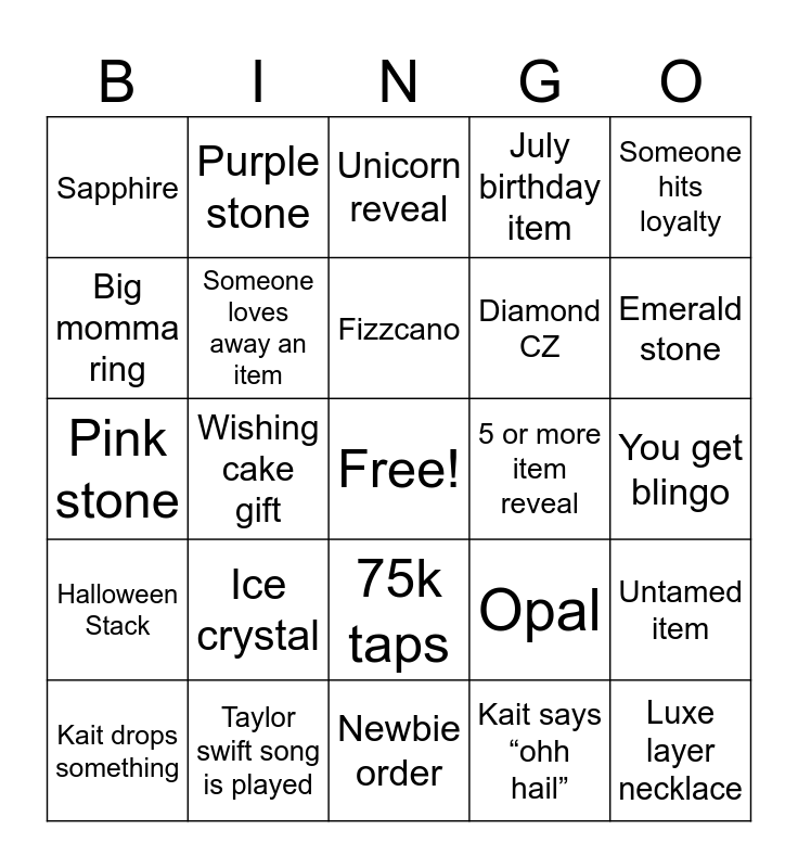 This bingo card has a free space and 34 words: Blooper, Kait says “ohh hail”, Sterling reveal, Black onyx, Halloween Stack, Someone loves away an item, Someone hits loyalty, Kait drops something, Purple stone, Lucky last, Fizzcano, Unicorn reveal, Peeker ring is picked, Yeet!, 5 or more item reveal, Emerald stone, Taylor swift song is played, Pink stone, Ice crystal, Opal, 75k taps, Kait says “I’m salty”, Sapphire, You get blingo, Newbie order, Luxe layer necklace, July birthday item, Yellow stone, Diamond CZ, Big momma ring, Someone gifts a Galaxy, Wishing cake gift, Untamed item and Sirens item.
