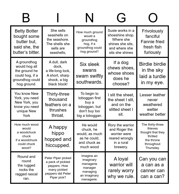 This bingo card has 25 words: How much wood would a woodchuck chuck if a woodchuck could chuck wood?, Peter Piper picked a peck of pickled peppers. How many pickled peppers did Peter Piper pick?, To begin to toboggan first buy a toboggan, but don't buy too big a toboggan., A loyal warrior will rarely worry why we rule., Frivolously fanciful Fannie fried fresh fish furiously, Betty Botter bought some butter but, said she, the butter’s bitter., She sells seashells on the seashore. The shells she sells are seashells,, How much ground would a groundhog hog, if a groundhog could hog ground?, I slit the sheet, the sheet I slit, and on the slitted sheet I sit., The thirty-three thieves thought that they thrilled the throne throughout Thursday., A groundhog would hog all the ground he could hog, if a groundhog could hog ground., A dull, dark dock, a life-long lock, A short, sharp shock, a big black block!, Imagine an imaginary menagerie manager managing an imaginary menagerie., Rory the warrior and Roger the worrier were reared wrongly in a rural brewery., Birdie birdie in the sky laid a turdie in my eye., Round and round the rugged rocks the ragged rascal ran., Thirty-three thousand feathers on a thrushes throat., Six sleek swans swam swiftly southwards., If a dog chews shoes, whose shoes does he choose?, Lesser leather never weathered wetter weather better, You know New York, you need New York, you know you need unique New York, A happy hippo hopped and hiccupped., He would chuck, he would, as much as he could, and chuck as much wood, Susie works in a shoeshine shop. Where she shines she sits, and where she sits she shines and Can you can a can as a canner can can a can?.
