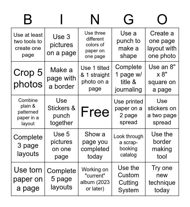 This bingo card has a free space and 24 words: Use 5 pictures on one page, Complete 5 page layouts, Use 1 tilted & 1 straight photo on a page, Use torn paper on a page, Create a one page layout with one photo, Use at least two tools to create one page, Crop 5 photos, Use 3 pictures on a page, Use printed paper on a 2 page spread, Show a page you completed today, Complete 1 page w/ title & journaling, Combine plain & patterned paper in a layout, Look through a scrap-booking catalog, Use the border making tool, Make a page with a border, Use the Custom Cutting System, Use stickers on a two page spread, Use three different colors of paper on one page, Use an 8" x 8" square on a page, Use Stickers & punch together, Try one new technique today, Complete 3 page layouts, Use a punch to make a shape and Working on "current" album (2023 or later).