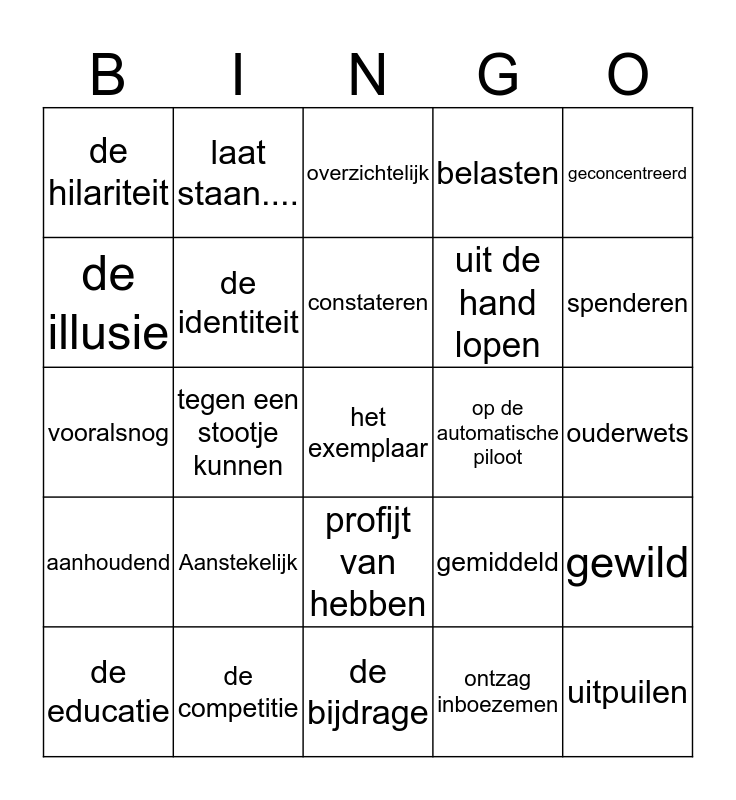 This bingo card has a free space and 24 words: Aanstekelijk, de competitie, constateren, de educatie, geconcentreerd, de hilariteit, de illusie, laat staan...., op de automatische piloot, profijt van hebben, uit de hand lopen, vooralsnog, gemiddeld, gewild, de identiteit, ontzag inboezemen, ouderwets, overzichtelijk, spenderen, tegen een stootje kunnen, uitpuilen, aanhoudend, belasten and de bijdrage.
