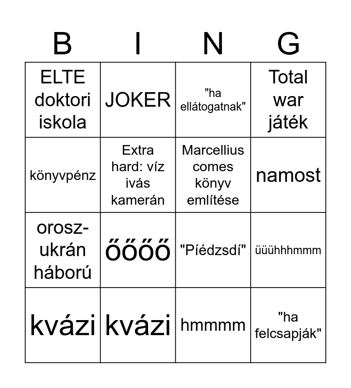 This bingo card has 18 words: őőőő, "ha felcsapják", "ha ellátogatnak", ELTE doktori iskola, "Píédzsdí", Total war játék, kvázi, JOKER, namost, orosz-ukrán háború, hmmmm, könyvpénz, üüühhhmmm, Extra hard: víz ivás kamerán, Marcellius comes könyv említése, datálása, kvázi and ühhhmmm.