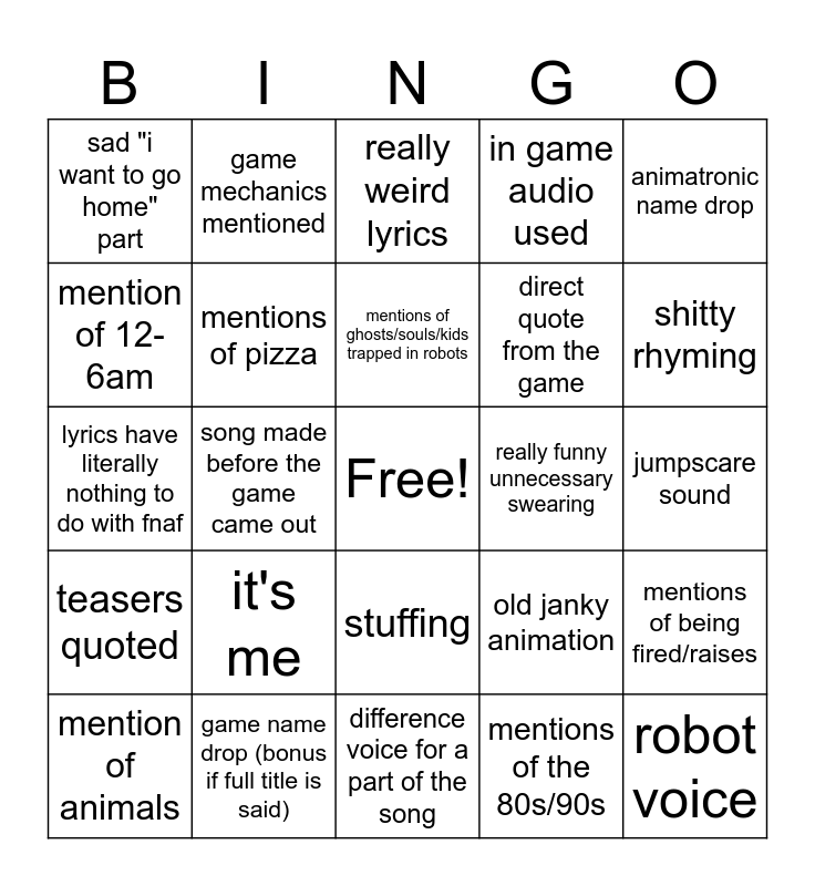 This bingo card has a free space and 24 words: it's me, game name drop (bonus if full title is said), mentions of ghosts/souls/kids trapped in robots, mention of animals, animatronic name drop, sad "i want to go home" part, mention of 12-6am, game mechanics mentioned, really funny unnecessary swearing, stuffing, direct quote from the game, lyrics have literally nothing to do with fnaf, old janky animation, mentions of being fired/raises, mentions of pizza, mentions of the 80s/90s, jumpscare sound, really weird lyrics, shitty rhyming, song made before the game came out, robot voice, teasers quoted, in game audio used and difference voice for a part of the song.