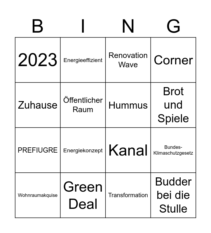 This bingo card has 16 words: Green Deal, Bundes-Klimaschutzgesetz, Renovation Wave, 2023, PREFIUGRE, Energieeffizient, Kanal, Transformation, Zuhause, Öffentlicher Raum, Wohnraumakquise, Corner, Energiekonzept, Brot und Spiele, Hummus and Budder bei die Stulle.