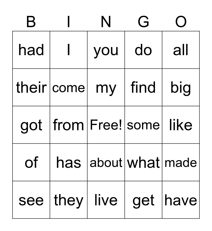 This bingo card has a free space and 24 words: has, they, my, see, all, had, their, I, some, about, find, got, what, made, come, get, like, you, big, from, have, of, do and live.