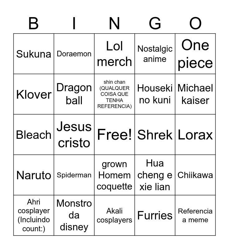 This bingo card has a free space and 29 words: Ahri cosplayer (Incluindo count:), Princesa da disney / cartoons, Jesus cristo, Mlp, Sukuna, Lol merch, Dragon ball, Spiderman, Shrek, Monstro da disney, Lorax, Referencia a meme, Akali cosplayers, Furries, Michael kaiser, Frieren, grown Homem coquette, Naruto, One piece, Bleach, Hua cheng e xie lian, Cosplay de gays, Houseki no kuni, Klover, Nostalgic anime, Doraemon, Chiikawa, shin chan (QUALQUER COISA QUE TENHA REFERENCIA) and Dislyte.