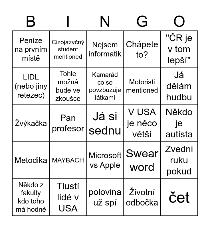 This bingo card has a free space and 24 words: MAYBACH, Tlustí lidé v USA, Kamarád co se povzbuzuje látkami, Někdo z fakulty kdo toho má hodně, "ČR je v tom lepší", Peníze na prvním místě, LIDL (nebo jiny retezec), Cizojazyčný student mentioned, V USA je něco větší, Microsoft vs Apple, Motoristi mentioned, Žvýkačka, Swear word, Zvedni ruku pokud, Tohle možná bude ve zkoušce, Životní odbočka, Někdo je autista, Nejsem informatik, Já dělám hudbu, Pan profesor, čet, Metodika, Chápete to? and polovina už spí.